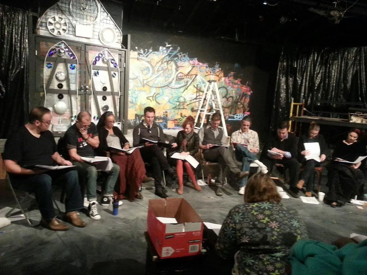 Yay for day one!! Here’s a mock up of the set design by Michael Schneider! And another photo of the amazing cast!!! (Left to Right) Bryan Krasner (Vandamar), Ezra Buzzington (Croup), ME, Devereau Chumrau (Hunter), Michael Homes (Richard Mayhew), Paula Rhodes (Lady Door), Jonathan Kells Phillips (Marquis de Carabas), Carlos Larkin (Gary/Islington), Marz Richards (Old Bailey/Earl), Julia Griswold (Puppeteer/Ensemble), Cassandra Vincent (Jessica/Lamia).